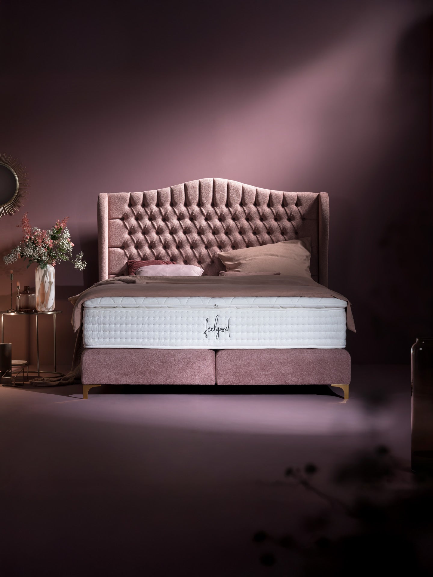 Premium- und Luxus-Boxspringbetten in ausgewählten Stoffen wie weichem Velours, schimmerndem Samt und Teddy Bouclé oder feinem Webstoff.
