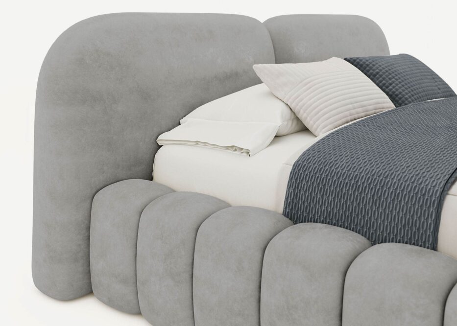 Das Polsterbett Kimi besticht durch sein einzigartiges Kopfteil, das in zwei separate, besonders dick gepolsterte Abschnitte unterteilt ist. Mit einer niedrigen Höhe von 100 cm und einem weichen Veloursbezug fügt es sich harmonisch in Ihr Schlafzimmer ein, insbesondere unter Dachschrägen. Die üppige Polsterung bietet hohen Komfort und verleiht dem Raum eine elegante, luxuriöse Atmosphäre.