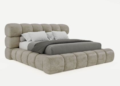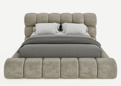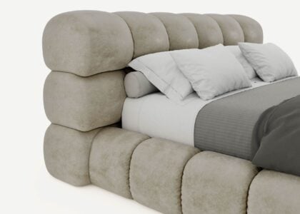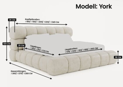 Das Polsterbett York zeichnet sich durch sein besonderes Kopfteil in Bubbles-Form aus, das sich ideal für Räume mit Dachschrägen eignet. Mit einer niedrigen Höhe von 100 cm und einem weichen Veloursbezug passt es sich harmonisch in Ihr Schlafzimmer ein. Die großzügige Polsterung sorgt für hohen Komfort und verleiht dem Raum eine luxuriöse Note. Perfekt für eine stilvolle und komfortbewusste Einrichtung.