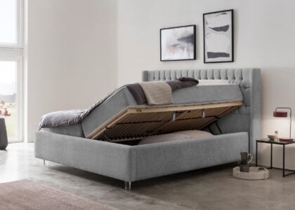 Wer Stauraum benötigt, wird mit diesem Polsterbett mit Bettkasten fündig. Der große Bettkasten lässt sich durch Gasdruckfedern leicht öffnen und bietet viel Stauraum zum Aufbewahren. Die optional erhältliche Hybridmatratze ist im selben Stoff bezogen, wie das Polsterbett.