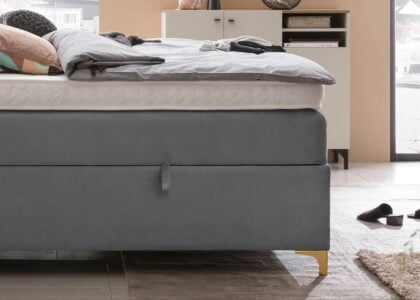 Gleiterfüße – sind 9 mm hohe Gleiter. Mit diesen Füßen verringert sich die Einstiegshöhe des Boxspringbettes von 60 cm auf 51 cm (beide Werte ohne Topper).