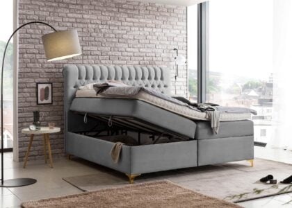 Wer Stauraum benötigt wird mit diesem Boxspringbett mit Bettkasten fündig. Der große Bettkasten lässt sich durch Gasdruckfedern leicht öffnen und bietet viel Stauraum zum Aufbewahren. Die Matratzen sind im selben Stoff bezogen, wie das Boxspringbett.