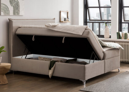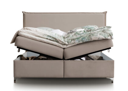 Wer Stauraum benötigt wird mit diesem Boxspringbett mit Bettkasten fündig. Der große Bettkasten lässt sich durch Gasdruckfedern leicht öffnen und bietet viel Stauraum zum Aufbewahren. Die Matratzen sind im selben Stoff bezogen, wie das Boxspringbett.
