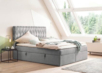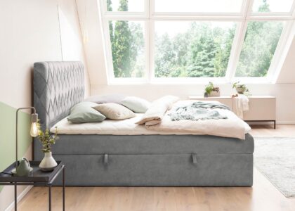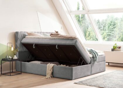 Wer Stauraum benötigt wird mit diesem Boxspringbett mit Bettkasten fündig. Der große Bettkasten lässt sich durch Gasdruckfedern leicht öffnen und bietet viel Stauraum zum Aufbewahren. Die Matratzen sind im selben Stoff bezogen, wie das Boxspringbett.