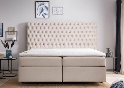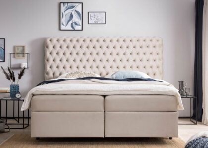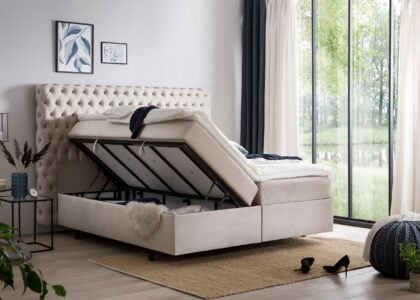 Wer Stauraum benötigt wird mit diesem Boxspringbett mit Bettkasten fündig. Der große Bettkasten lässt sich durch Gasdruckfedern leicht öffnen und bietet viel Stauraum zum Aufbewahren. Die Matratzen sind im selben Stoff bezogen, wie das Boxspringbett.