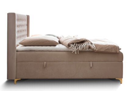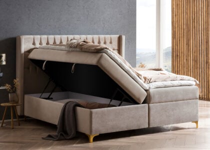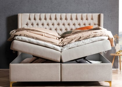 Wer Stauraum benötigt wird mit diesem Boxspringbett mit Bettkasten fündig. Der große Bettkasten lässt sich durch Gasdruckfedern leicht öffnen und bietet viel Stauraum zum Aufbewahren. Die Matratzen sind im selben Stoff bezogen, wie das Boxspringbett.