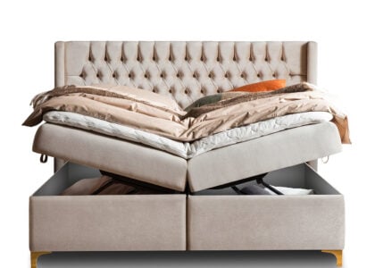 Die Matratze ist eine 7-Zonen Taschenfederkern-Matratze und sorgt für angenehmen Schlaf. Taschenfedern bewegen sich unabhängig voneinander und passen sich der Körperform und den Bewegungen an. Die punktelastische Verteilung ist eines seiner hervorzuhebenden Merkmale. Für maximale Stabilität sorgt ein hochwertiger Metallrahmen umkleidet mit einem rundum Bezug aus dem selben Stoff wie das Boxspringbett. Die Matratze mit dem Stauraum, besitzen mit ihren 51 cm (ohne Topper mit Gleiterfüßen) eine komfortable Einstiegshöhe.