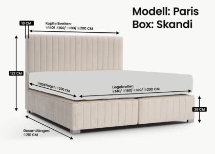 Das Modell Paris mit seiner Pfeifensteppung ist optisch in viele schmale, senkrechte Streifen geteilt. Die einheitlich breiten Steppungen sind tief verarbeitet und wirken durch ihre weiche Polsterung sehr voluminös. Die Kopfteilhöhe wird in verschiedenen Höhen angeboten und kommt zur Geltung, je höher das Kopfteil gewählt wird.
